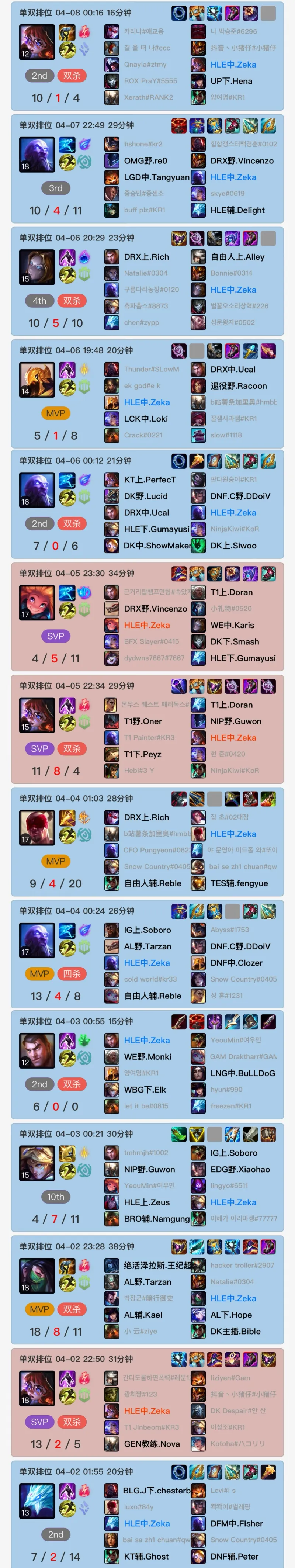 3月底Zeka重回韩服第一后一直霸榜至今,Rank的状态也是猛如虎各种乱杀。